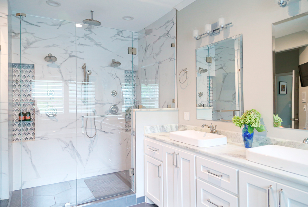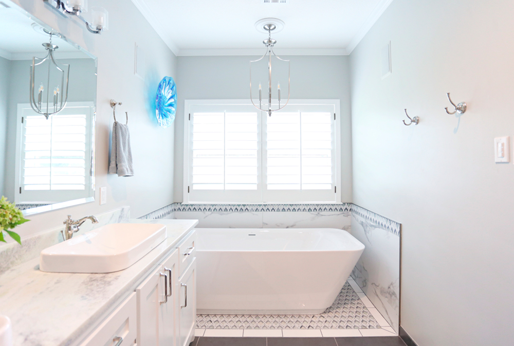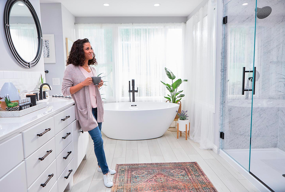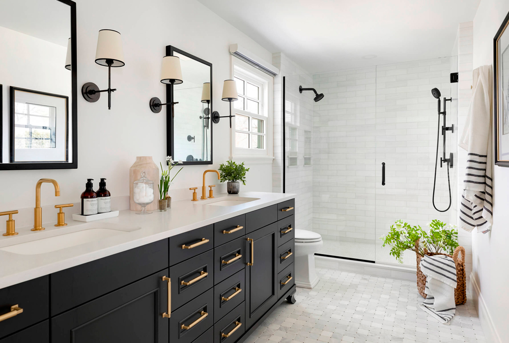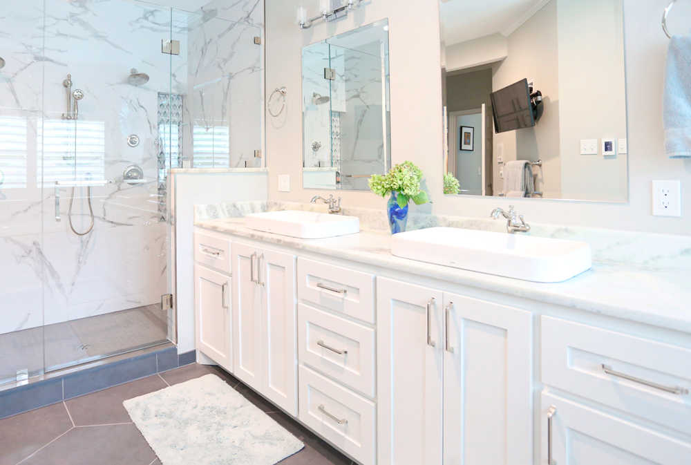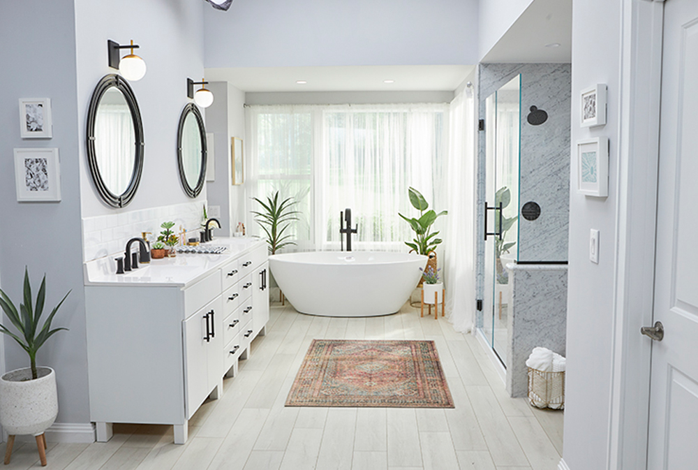 Selection of tiles, floors, sinks, taps, bathtub/shower, cabinets, etc.
