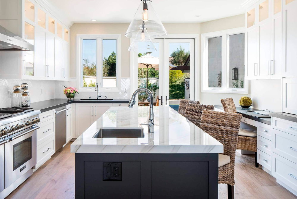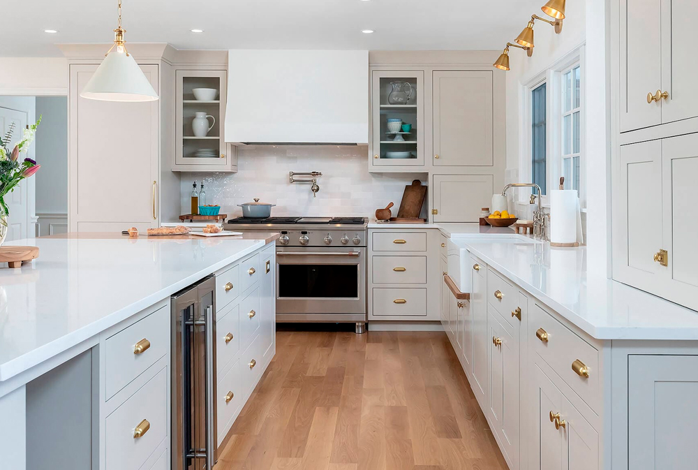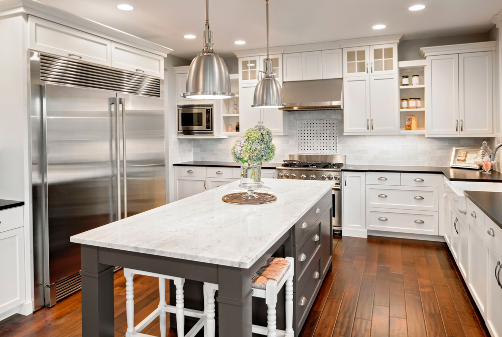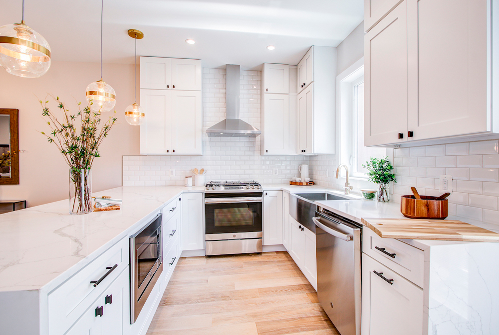 Selection of kitchen cabinets, countertops, appliances, flooring, tiles.